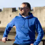 Standard cut, cut and sewn, hood with metal drawcord, 2×2 ribbing on sleeves and bust, hip pocket with tricolour detail pinched on left pocket.